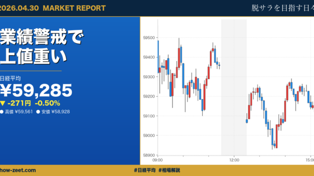 4月30日(木)の東京株式市場は、日経平均株価が前日比632.54円安(-1.06%)の59,284.92円で取引を終えました。始値は59,484.71円で、場中の高値は59,560.57円、安値は58,928.20円と、日中値幅は約…